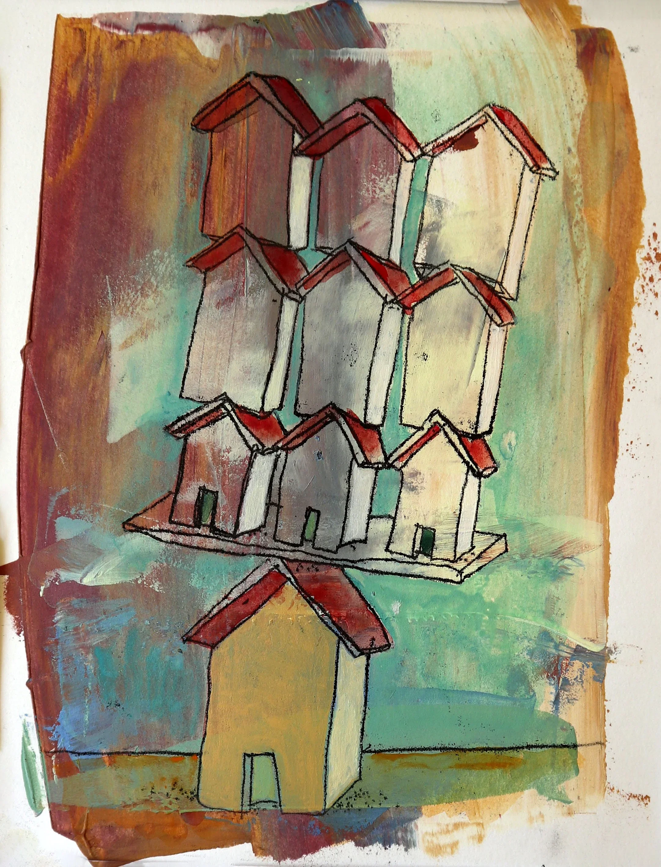 James Rees’s painting A Support to Others shows a single house upholding many others stacked above it. About the work, James explains: “The work really highlights the need we have within our communities to support each other. Sometimes we’re in the role of being supported, but quite often we’re the one lifting others.”